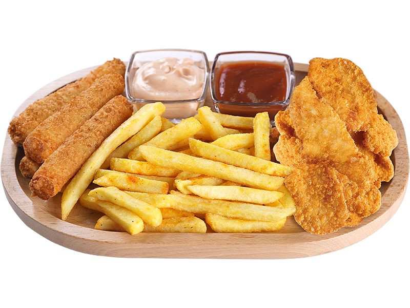 Картофель фри, сырные палочки, наггетсы куриные, кетчуп, розовый соус 370/40/40