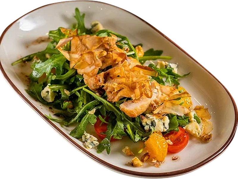 Руккола, кнсервированный мандарин, томаиы черри, грецкий орех,цыпленок гриль, бальзамическая заправка, сыр с голубой плесенью, стружка тунца.180гр